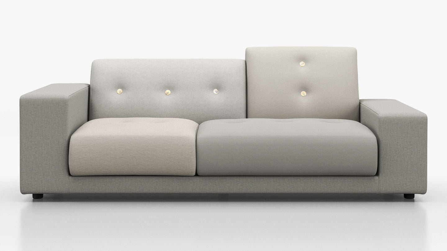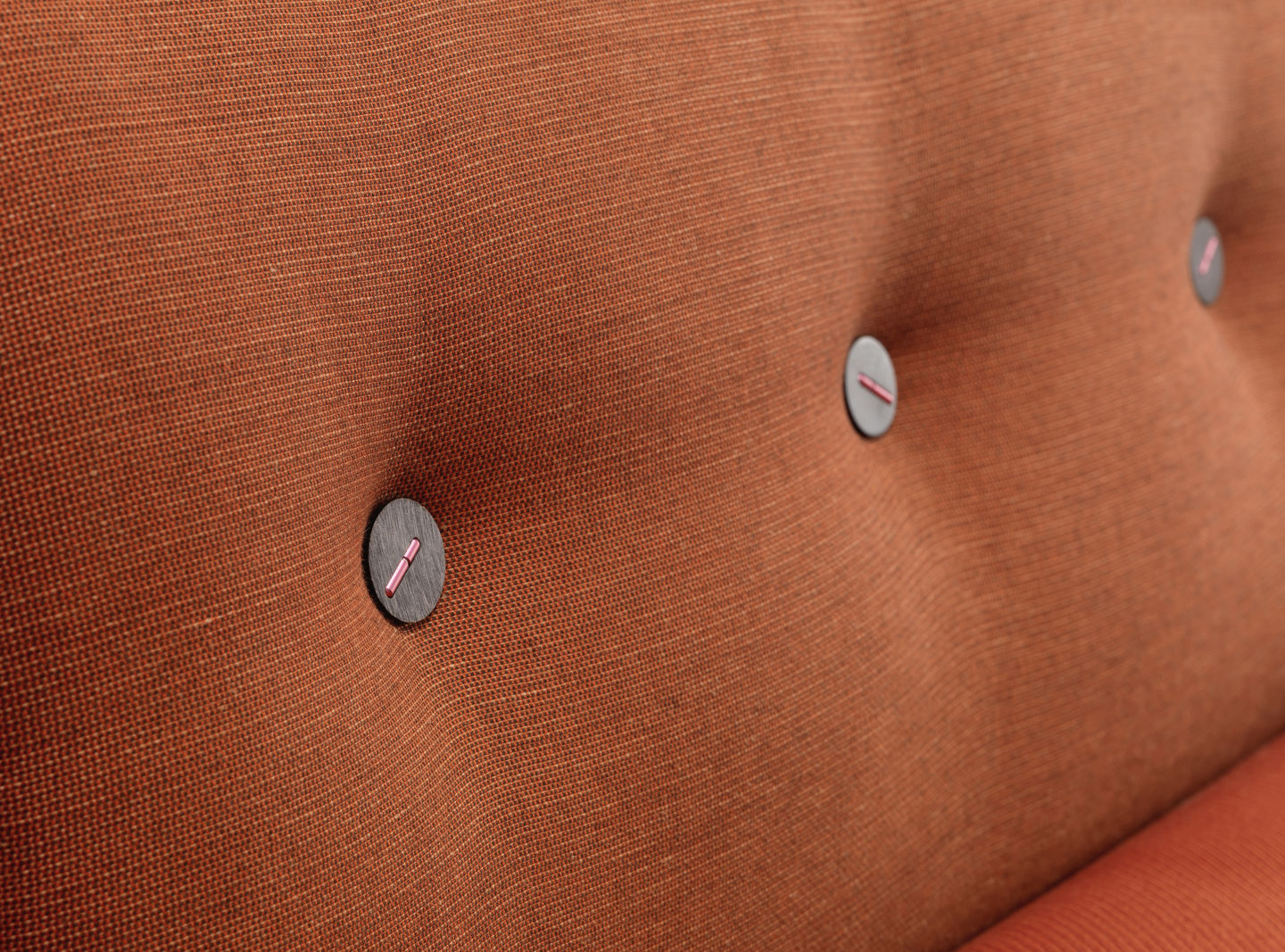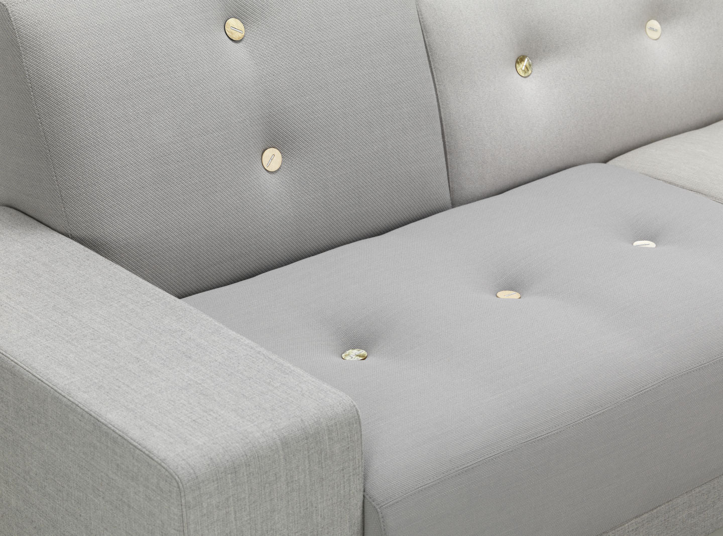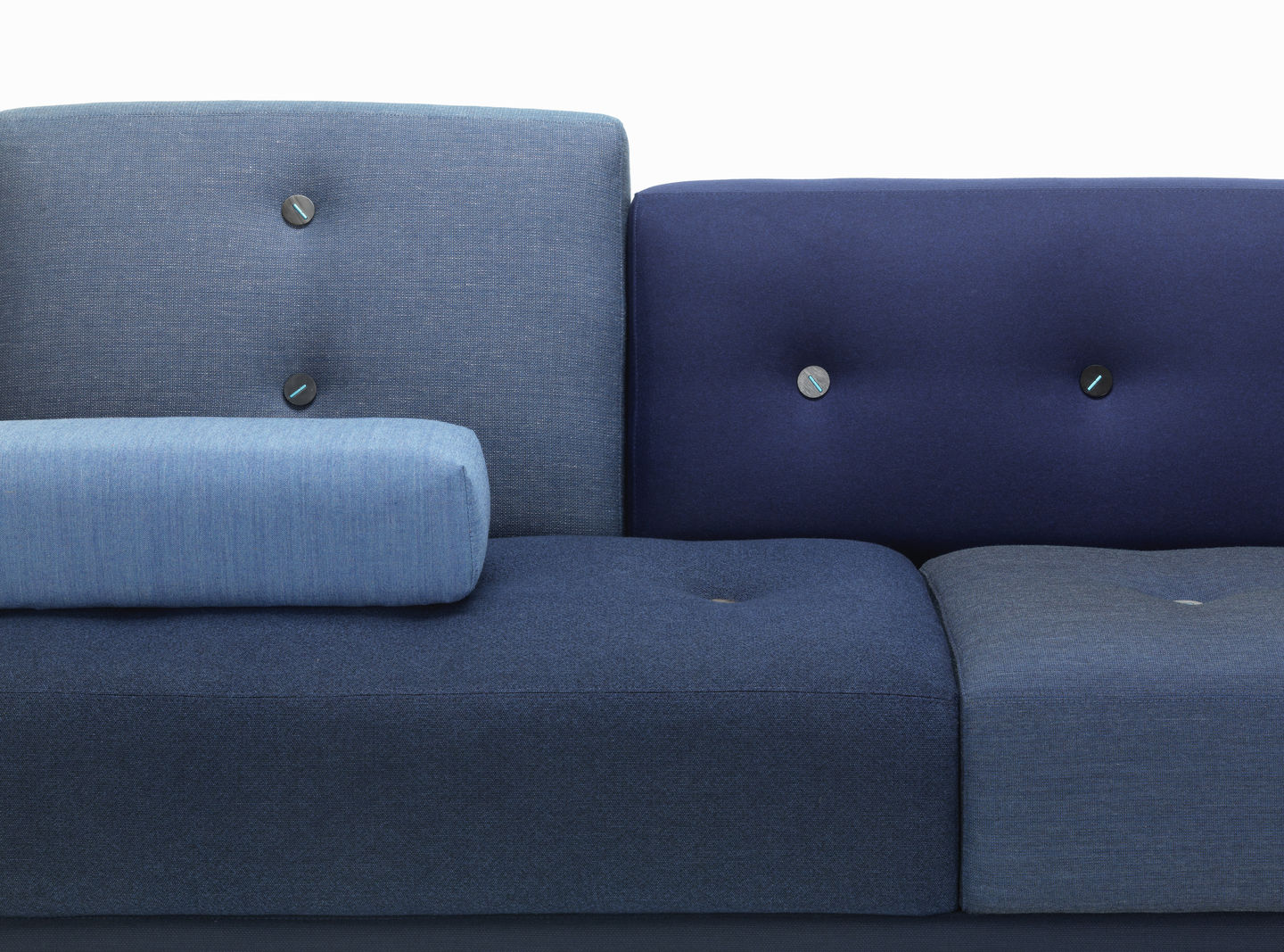 La estructura y los cojines acolchados de los sofás están forrados con distintos tipos de tejidos y en colores cuidadosamente coordinados: varios tonos de verde, rojo, amarillo oro o azul oscuro. En estos sofás no se utilizan telas de tapicería comerciales, sino tejidos desarrollados exclusivamente para Vitra por Hella Jongerius; son materiales pensados para intensificar el sutil juego de colores y texturas que caracteriza a este diseño. Los botones de los sofás Polder, diseñados por Jongerius en un collage de aluminio, cuero y plástico de colores, son un detalle verdaderamente sorprendente. No solo ofrecen un bello contraste con los suaves tejidos de la tapicería, sino que también facilitan la retirada de las fundas para su limpieza mediante un sencillo dispositivo de fijación.